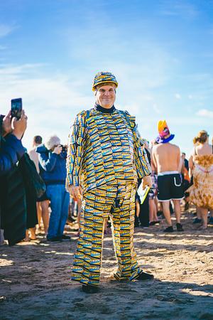 Metrocard Man photographed at the annual polar plunge. Coney Island, 2018.